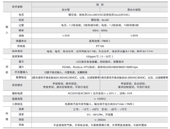 技術要求:輸入三相電壓AC220V;輸入電流AC5A;投切方式順序投切;補償方式三相共補;投切控制路數6路;開關量輸入6路;柜內溫度檢測。