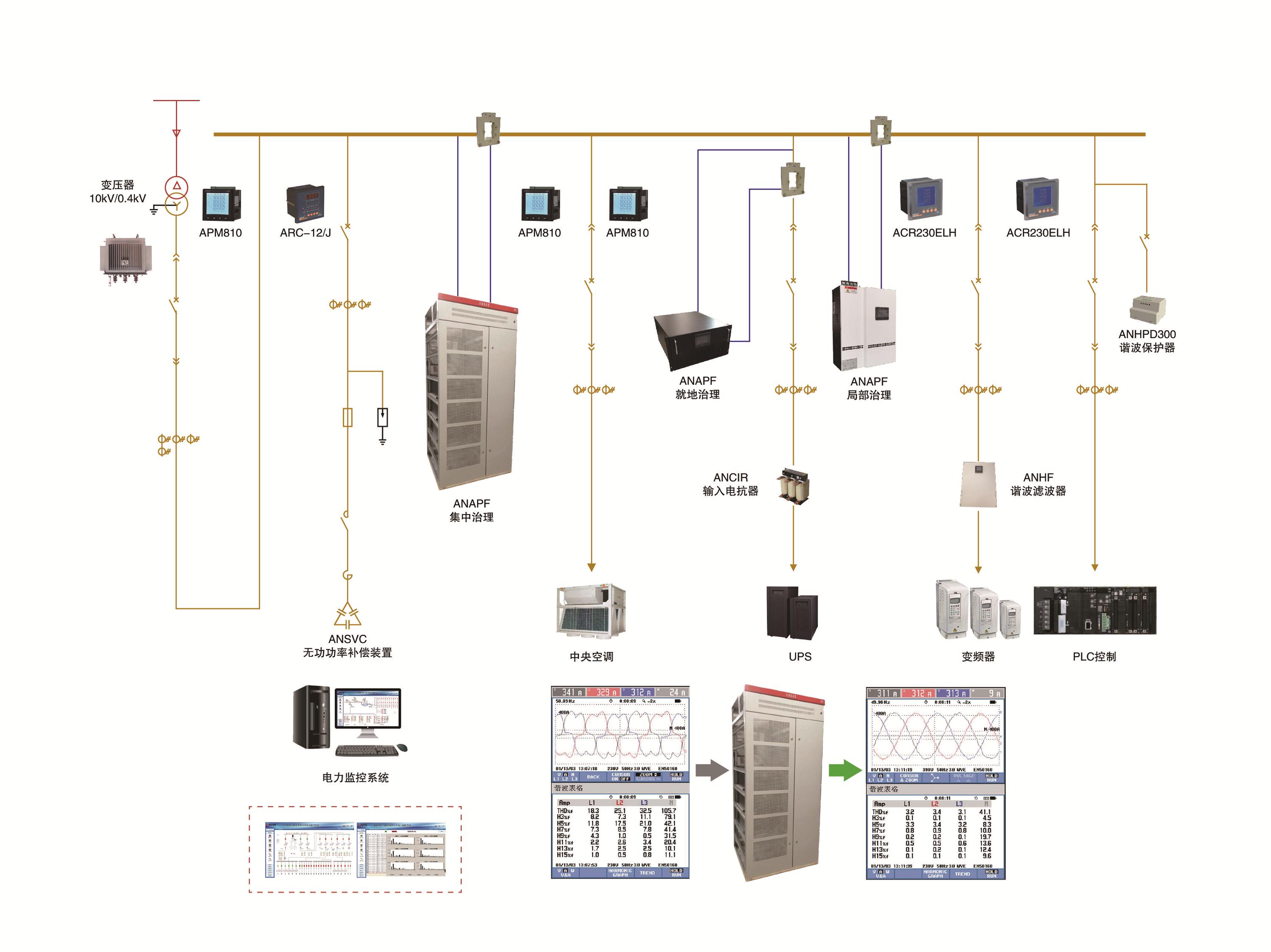 該產品具備RS485通訊接口,其所采樣得到的電壓、電流、頻率、有功功率、無功功率、諧波含量、功率因數、溫度可通過通訊接口傳送到其它外部設備。產品具備過電壓、欠電壓、欠流鎖定、斷相、過畸變、溫度保護功能。