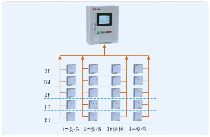 系統(tǒng)采用安科瑞防火門監(jiān)控系統(tǒng),該系統(tǒng)主要采用分層分布式網(wǎng)絡(luò)結(jié)構(gòu),系統(tǒng)結(jié)構(gòu)為:站控管理層、網(wǎng)絡(luò)通訊層和現(xiàn)場設(shè)備層。其中黃巖博物館項(xiàng)目現(xiàn)場設(shè)備分布為B1至3F常閉防火門。該系統(tǒng)監(jiān)控所有樓道內(nèi)的常閉防火門且實(shí)時(shí)監(jiān)測防火門狀態(tài),如有異常會(huì)后臺(tái)報(bào)警。所有監(jiān)測模塊通過二總線鋪設(shè)至消防控制室,防火門監(jiān)控主機(jī)從而完成對監(jiān)測模塊的采集并監(jiān)控。