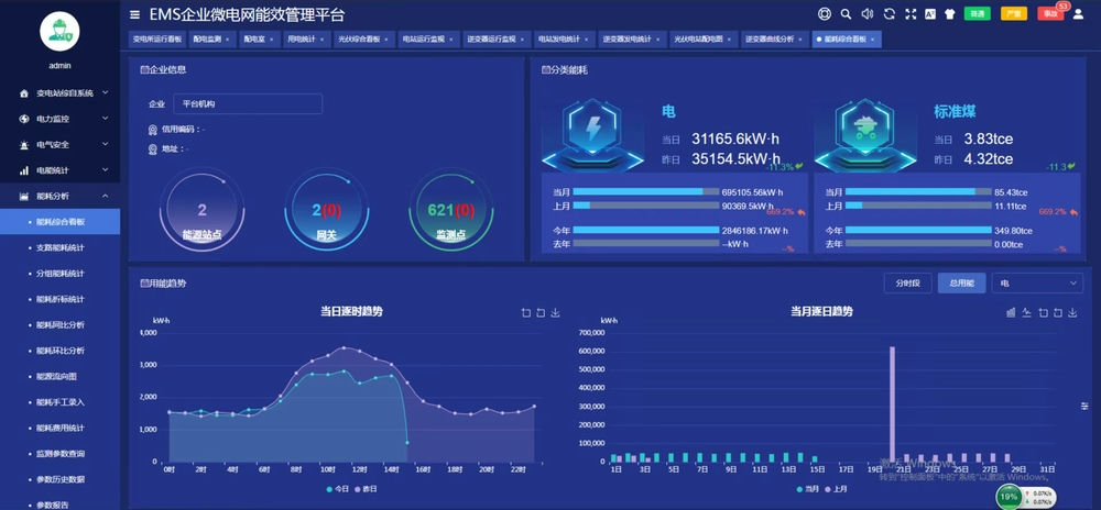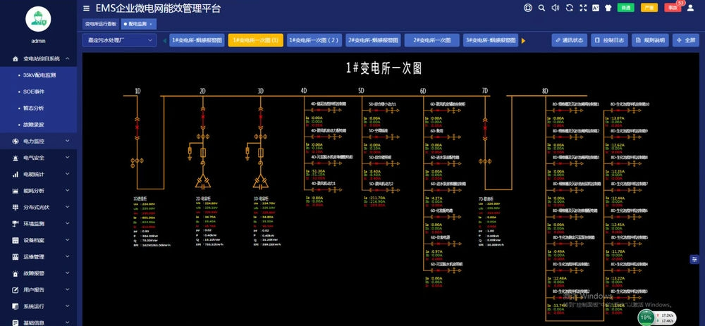 嘉定污水處理廠EMS電能管理系統項目分為三個低配間,兩個箱變和光伏設備,做到數據互通,電力數據實時顯示在電力一次圖上面。