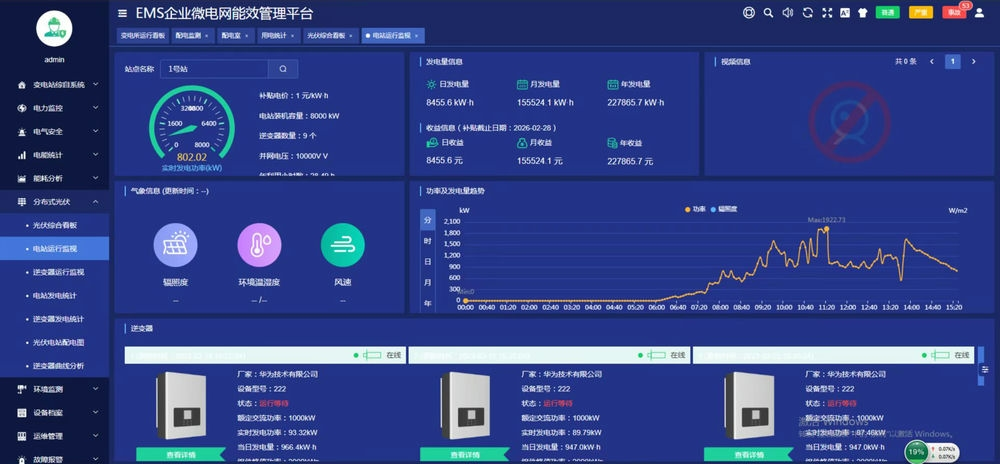 采用EMS能源管理解決方案,采集電表和逆變器的電壓電流功率電能等數據,形成電能一次系統圖,實現用電的智能化管理。在每一個配電間還加裝有煙感、水浸、門磁等來監測配電間整體環境狀態保證用電的安全性。在配電環節加裝有我們公司的電能質量和濾波裝置更好的保證了用電的可靠性。