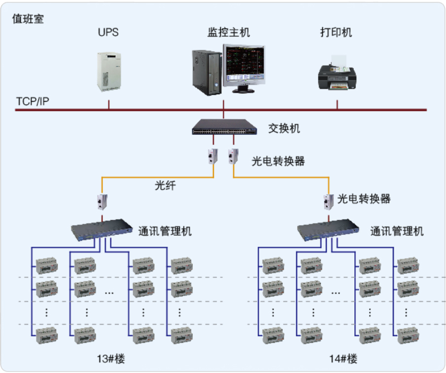 該項目有兩棟樓,均為六層,一共有532個房間,其中13#棟彝學院289個房間,14#棟藏學院243個房間,采用我司ADF100單相多用戶電能表195個,分為24條RS485總線接至通訊管理機,通訊管理機通過光纖拉至值班室連接到Acrel-3000預付費電能管理系統(tǒng)后臺,實現(xiàn)總線上儀表與監(jiān)控主機的數(shù)據(jù)連通。該系統(tǒng)為學校宿舍項目解決用電問題提供了真實可靠的依據(jù),取得了較好的管理水平。