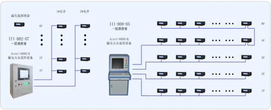 三湘廣場由III-D02-07地塊和III-D08-05地塊各自一獨棟商業建筑組成。為了確保本地塊的樓宇的電氣安全,現在樓層內的配電箱進線端安裝安科瑞品牌ARCM系列漏電流探測器,由此來實時監測變電所內重要回路的漏電流,并在III-D02-07地塊和III-D08-05地塊消控室內安裝ACREL-6000電氣火災監控設備,以確保變電所配電系統的電氣安全。