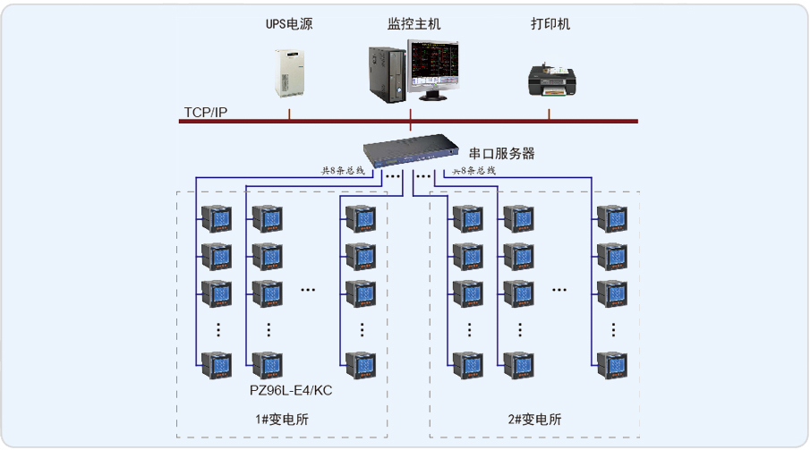 系統(tǒng)組網(wǎng)采用常見的3層結(jié)構(gòu),站控管理層、通訊管理層和現(xiàn)場設(shè)備層。上位機軟件采用Acrel – 2000電力監(jiān)控軟件,通過軟件進行設(shè)備配置、數(shù)據(jù)庫變量配置、界面設(shè)計等,完成了在上位機軟件監(jiān)控及電力監(jiān)控的功能。具體如下: