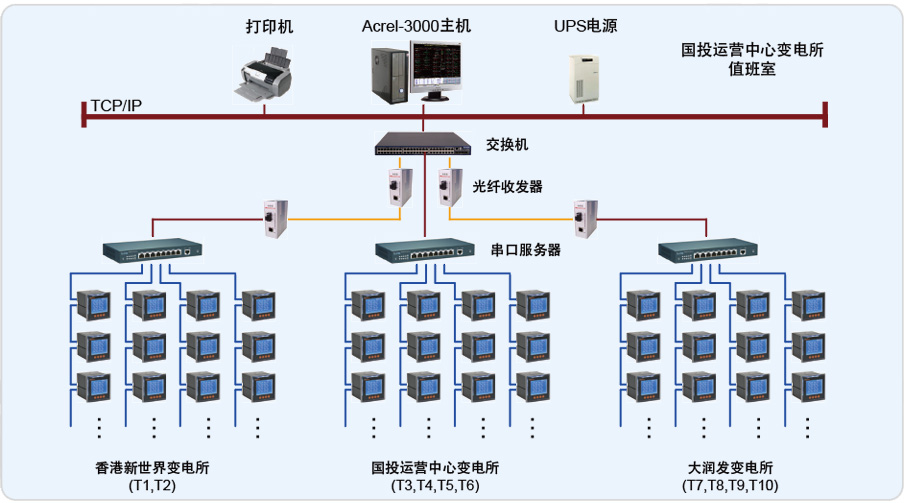 本電能管理系統主要實現先鋒國際廣場三個變電所的0.4kV配電系統的用電監測與電能管理;監測范圍為香港新世界變電所的T1、T2,國投運營中心變電所的T3、T4、T5、T6,以及大潤發變電所的T7、T8、T9、T10變壓器的低壓進線柜、聯絡柜、饋線柜中的智能電力儀表,從而實現遠程實時監測和電能管理。該系統總計有420只PZ80-E4/C儀表,分20條總線,由于三個變電所之間距離較遠,并且較為分散,采用每個變電所內自行組網,然后通過先鋒國際的視頻監控光纖傳至到國投運營中心的消控中心,通過光電轉換器和交換機,連接至監控電腦,實該現場總線上儀表與監控主機的數據連通。