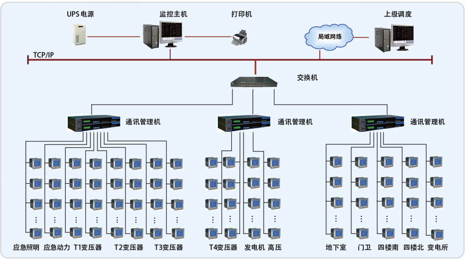 本監控系統主要實現對月亮灣集中供冷中心的20/0.4kV配電系統進行監 控;監控范圍為變電所的T1、T2、T3、T4變壓器進線柜、聯絡柜、應急照明配電屏1/2、應急動力配電屏1/2、高壓柜、變電所的1/2#柴油發電機配電屏和各樓層所有動力柜。總共300個回路。