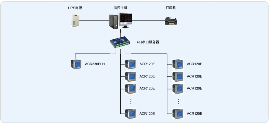 廠區(qū)配電中心為本項(xiàng)目提供一套高、低壓后臺監(jiān)控系統(tǒng),將對廠區(qū)內(nèi)電氣室中改造安裝的19塊智能電測儀表進(jìn)行集中監(jiān)視。具體監(jiān)控?cái)?shù)據(jù)為:用電量計(jì)量、實(shí)時測量相電壓、線電壓、有功功率、無功功率、視在功率、功率因數(shù)、頻率等數(shù)據(jù),能打印月度用電報(bào)表,并有歷史曲線的查詢(時間不小于30天),重要回路需要對其諧波進(jìn)行測量。各參數(shù)及數(shù)據(jù)通過RS485總線,通過網(wǎng)絡(luò)送至配電中心的電工值班室(后臺監(jiān)控中心)。