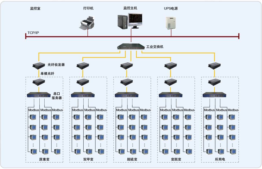中化平原電力監(jiān)控系統(tǒng)現(xiàn)場(chǎng)分為5個(gè)低壓配電室,配電室內(nèi)采用安科瑞PZ系列電力監(jiān)控儀表采集各回路的電流、電壓、電能等電參量,然后通過中間層采集設(shè)備經(jīng)光纖傳到監(jiān)控室計(jì)算機(jī)上,實(shí)現(xiàn)遙測(cè)、遙信功能。