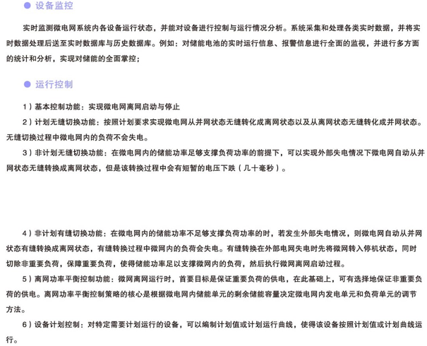 微電網能量管理控制系統用于保障微電網的穩定和經濟優化運行。其是一種計算機系統,包括提供基本支持服務的軟件平臺,以及提供使微電網內發電、配電、用電設備有效運行所需功能的一套應用軟件,是微電網監控系統核心,擔負著系統電源管理、負荷管理以及統計分析、評估等功能。微電網微電網能量管理控制系統基本功能包括數據信息采集和處理、數據庫管理、人機界面、設備控制等。系統控制功能包括微網運行基礎控制、計劃無縫切換控制、外部故障下的無縫切換控制、離網功率平衡優化控制、功率波動平滑控制等。系統應用功能包括分布式電源的運行分析與展示、微網運行效益分析、有功功率整體優化控制、無功電壓整體優化控制、電能質量優化控制等。