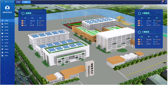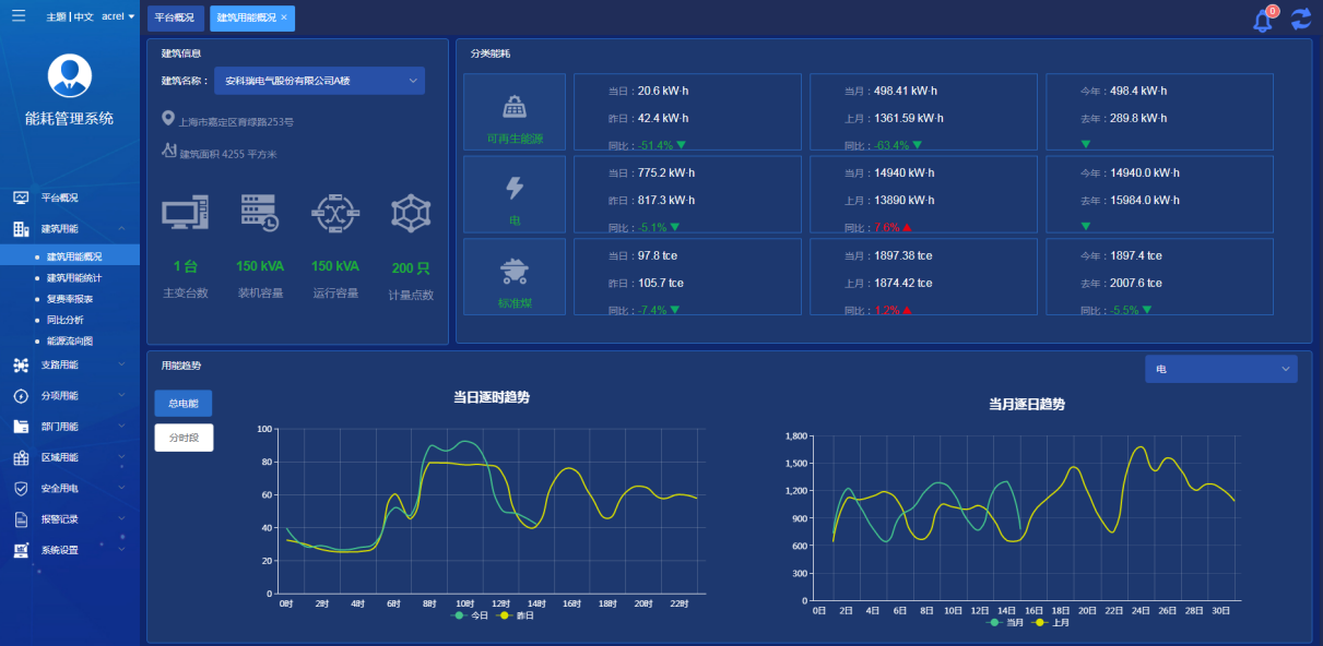 平臺運行狀態,當月能耗折算、地圖導航,各能耗逐時、逐月曲線,當日,當月能耗同比分析滾動顯示。