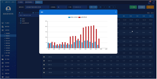 對建筑、區域、分項、支路等結構按日、月、年報表的形式統計對分類能源用能進行統計,支持報表數據導出EXCEL,支持選擇建筑數據進行生成柱狀圖。