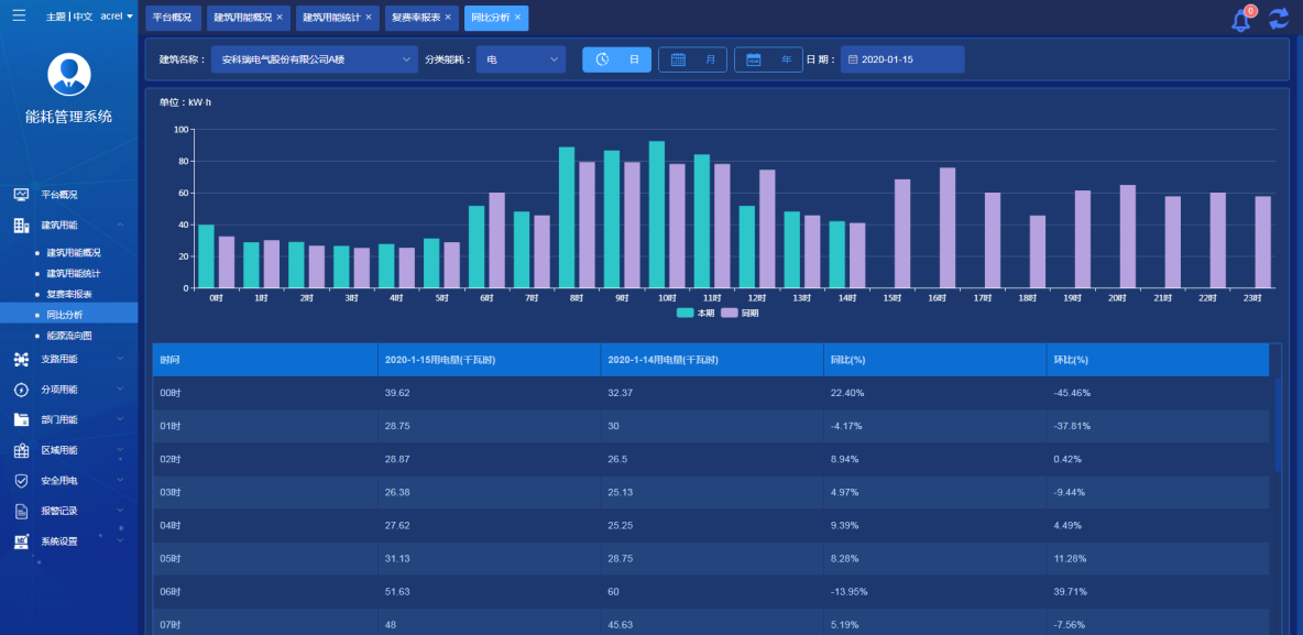 對建筑、分項、區域、支路等用能按日、月、年以圖形和報表結合的方式進行用能數據同比分析。