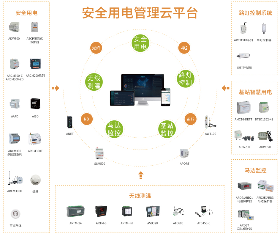 基于安全用電云平臺(tái),演化出了無(wú)線測(cè)溫,基站智慧用電,路燈控制系統(tǒng)和馬達(dá)監(jiān)控云平臺(tái)。