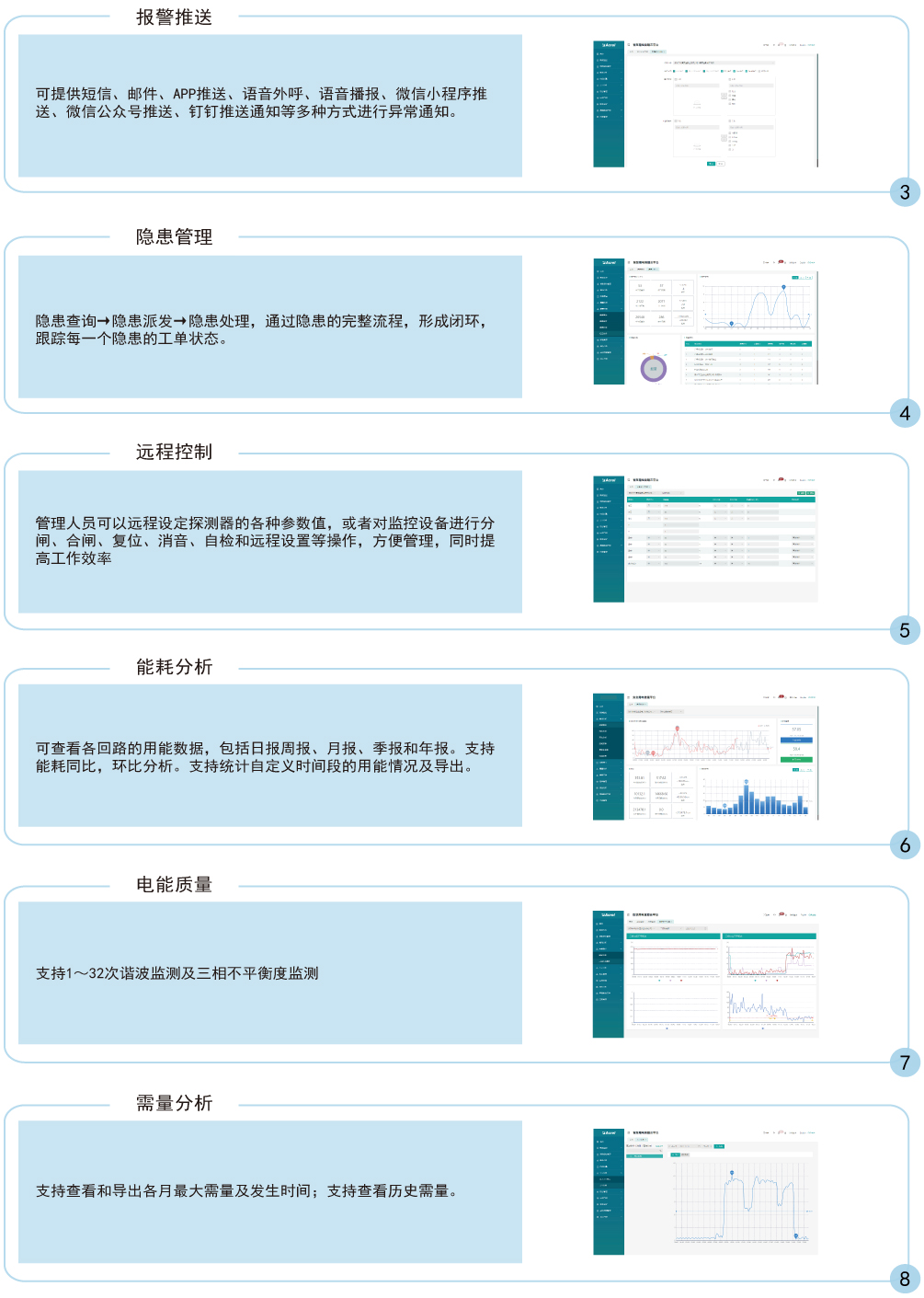 2.2、平臺(tái)能夠?qū)τ诒O(jiān)測(cè)點(diǎn)的電壓相序、電壓電流不平衡度、三相電流總諧波含量、三相電流2-31次諧波、三相電壓總諧波含量、三相電壓2-31次諧波、實(shí)時(shí)需量、最大需量都能夠進(jìn)行有效監(jiān)控,為提高用電質(zhì)量提供依據(jù)。