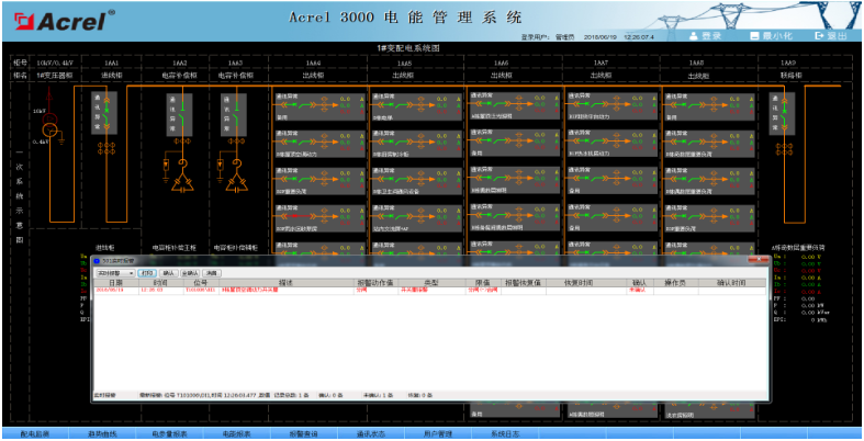 系統具有實時報警功能,系統能夠對配電回路斷路器、隔離開關、接地刀分、合動作等遙信變位,保護動作、事故跳閘,以及電壓、電流、功率、功率因數越限等事件進行實時監測,并根據事件等級發出告警。系統報警時自動彈出實時報警窗口,并發出聲音或語音提醒。
