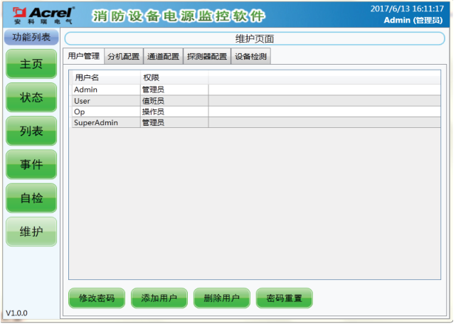 該界面可添加新的“操作員”和“值班員”權限的新用戶,也可刪除這兩個級別的現(xiàn)有用戶,該管理功能只有“超級管理員”和“管理員”可進行操作。