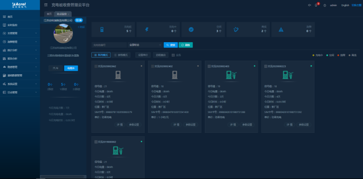 | 電瓶車智能充電樁 | AcrelCloud-9500 | (一)資源管理 充電站檔案管理,充電樁檔案管理,用戶檔案管理,充電樁異常 交易監測 (二)交易結算 充電價格策略管理,預收費管理,賬單管理,營收和財務相關報表 (三)用戶管理 用戶注冊,用戶登錄,用戶帳戶管理 (四)充電服務 充電設施搜索,充電設施查看,地圖尋址,在線自助支付充電, 充電結算,導航等 (五)微信小程序 掃碼充電,賬單查詢、充電信息監測等功能 (六)數據服務 數據采集,數據存儲和解析 (七)收益隔天結轉到帳 |