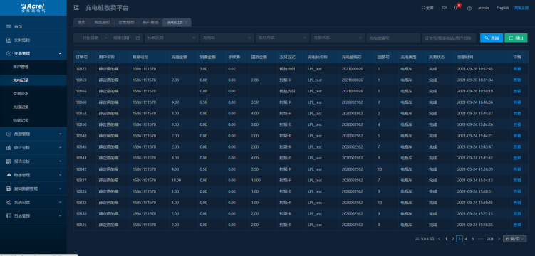充電站檔案管理,充電樁檔案管理,用戶檔案管理,充電樁運行監測,充電樁異常交易監測。