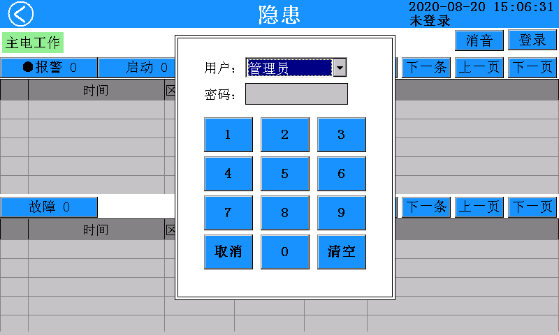 余壓監控器上電后,監控軟件自動運行,顯示屏顯示程序未登錄狀態下的主頁面,此時軟件已經準備就緒,等待用戶登錄