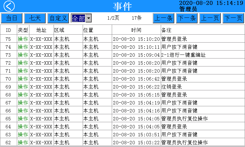 在該頁面內可查詢任意時段內的報警、故障、事件記錄。點擊“當日”按鈕查詢當日所有記錄,點擊“最近7天”按鈕查詢最近7天所有記錄。點擊“自定義”按鈕可以選擇時間范圍內再進行查詢