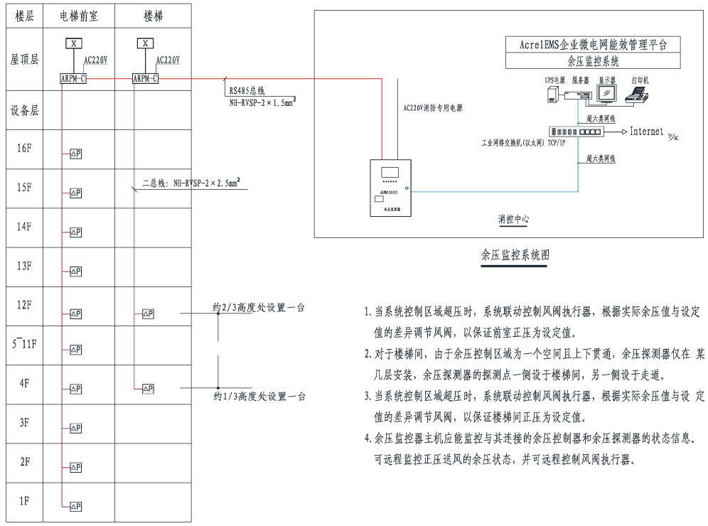 在建筑物內公共區域走道、封閉樓梯間、防煙樓梯間及其前室、消防電梯及其前室或合用前室等處設置余壓探測器,用于檢測相應區域兩側的壓力差值;加壓風機處設置余壓控制器,當加壓送風機啟動后,控制器根據余壓探測器超壓/加壓動作指令,控制泄壓閥動作,確保上述區域的壓差值滿足規范要求;泄壓閥處安裝風閥執行器,用于將余壓控制器輸出的控制信號轉換為執行動作,控制泄壓的開關,實現加壓送風系統的風量隨系統調節,余壓監控器安裝在安防消防控制室。根據用戶的需求,余壓監控系統可以滿足與AcrelEMS企業微電網管理云平臺或電氣火災自動報警系統等進行數據交換和共享。