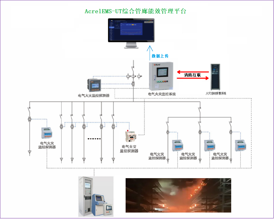 電氣火災監控系統作為火災自動報警系統的預警子系統,由電氣火災監控主機、電氣火災監控單元、剩余電流式電氣火災探測器以及測溫式電氣火災探測器組成,通過現場消防環網和消防總線構成一套完整的預防電氣火災的監控系統,數據可集成至管廊的AcrelEMS-UT能效管理系統并提供預警信號。