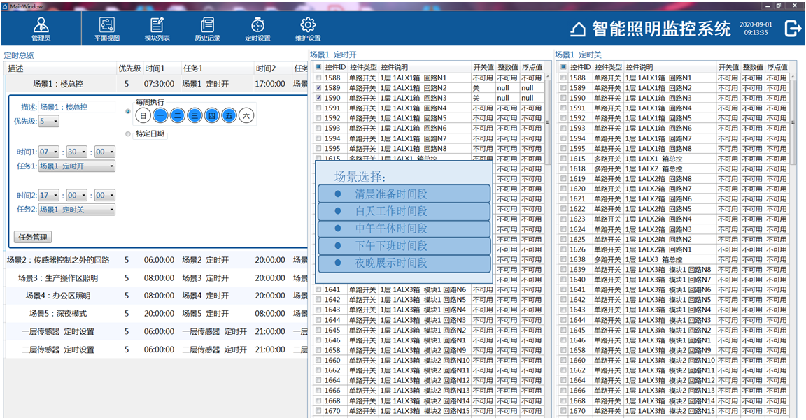 系統支持單控、區域控制、自動控制、感應控制、定時控制、場景控制、調光控制等多種控制方式,支持延時控制,避免同時亮燈負荷對配電系統造成沖擊。模塊不依賴系統,可獨立工作,每個模塊均自帶時間模塊,可根據經緯度自動識別日出日落時間實現自動控制功能。