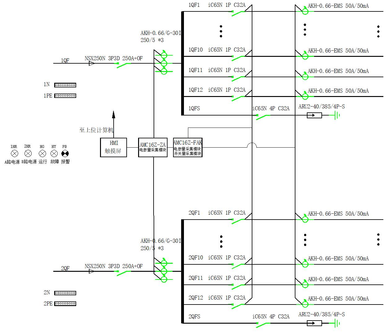安科瑞交流精密配電監(jiān)控裝置系列是專門針對于數(shù)據(jù)中心服務器電源管理設計的測量裝置。該裝置設計小巧,能夠對 A+B 兩路進線和 96或192路出線的全電參量參數(shù)、輸入輸出開關及防雷器狀態(tài)等實時監(jiān)測, 所有測量通道的告警閾值均可單獨設定,出線越限事件立即觸發(fā)系統(tǒng)聲光告警,在傳統(tǒng)儀表的體積上實現(xiàn)了監(jiān)控回路的高度集成。如典型配電圖。