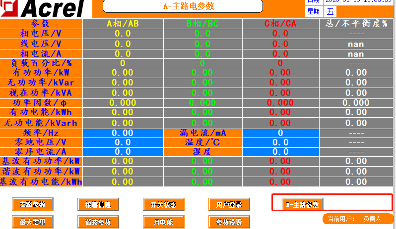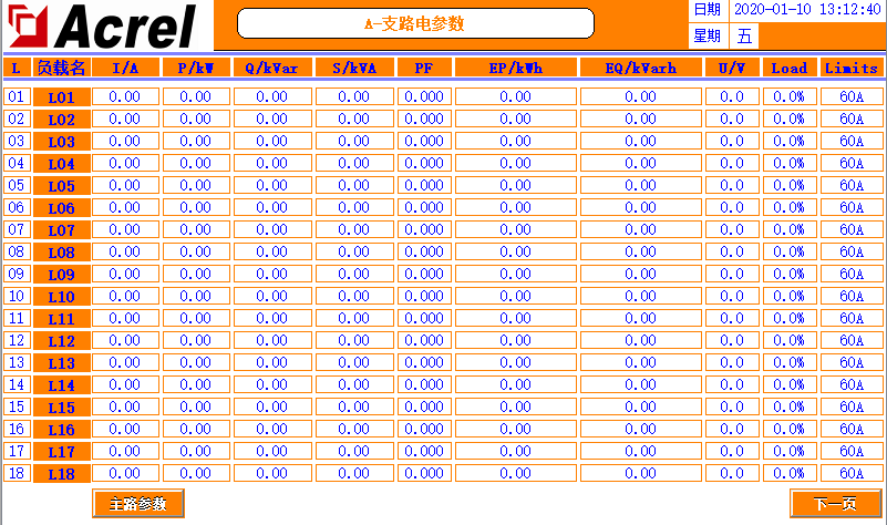 觸摸屏開啟后的第一個界面為主路參數(shù)界面,如果有多路進線,可點擊右下角的按鈕切換查看其它進線的參數(shù)。